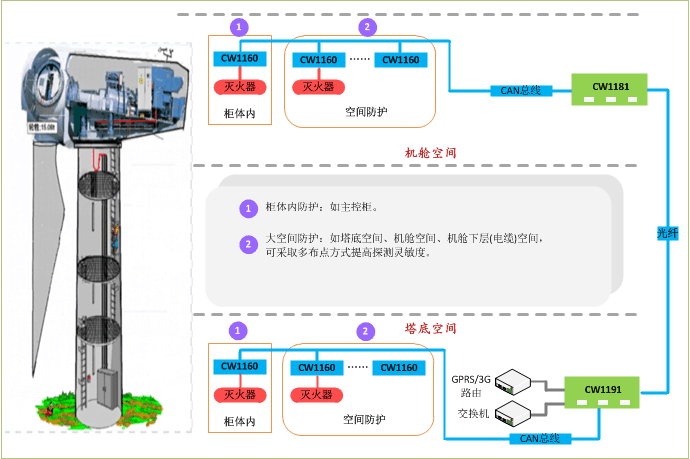 系统依照“以防为主,以消为辅”的设计,使用高灵敏度的火情数据传感器,探测风力发电机机舱控制柜、齿轮箱高速轴制动器、发电机定子接线盒外、发电机转子滑环室外、电气盘柜(变流器、主控系统等)、机舱等主要风机内各空间起火临界点之前所产生的微量烟雾、CO浓度、火焰状态等信息,并监测实时温度,采用多传感器冗合智能判断机制,实时可靠判断危险点状态及燃烧阶段,通过专业火灾报警控制器实现数据通讯、本地控制,通过主站软件实现远程数据监测和控制;在发现火灾数据报警紧急情况时,系统根据预置逻辑,实施自动控制和联动控制,进行预警和消防。