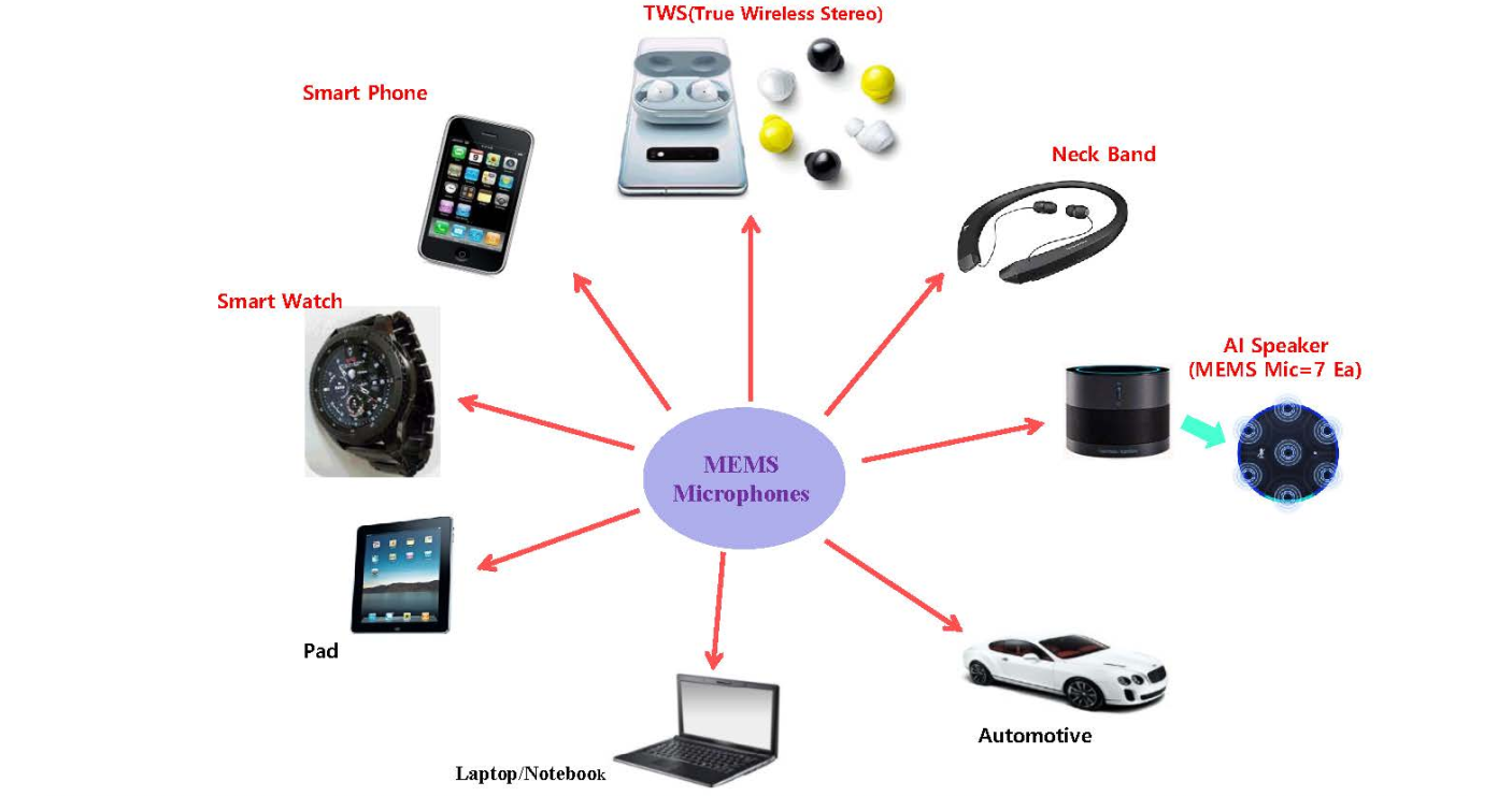 现韩国企业可以提供包括模拟和数字信号处理芯片和音响传感器在内的性能出色的硅麦。该产品模拟及数码立体声输出出色,具有高语音捕捉能力,高信号大杂音比及低噪音特征。拥有的集成的Sigma-Delta调制的变换器和模拟器可提高声音的音质和性能,可最大程度地减少电源消耗。利用复杂传感器技术能力,可以广泛应用于智能手表、智能手机、颈带、平板电脑、笔记本和汽车等。