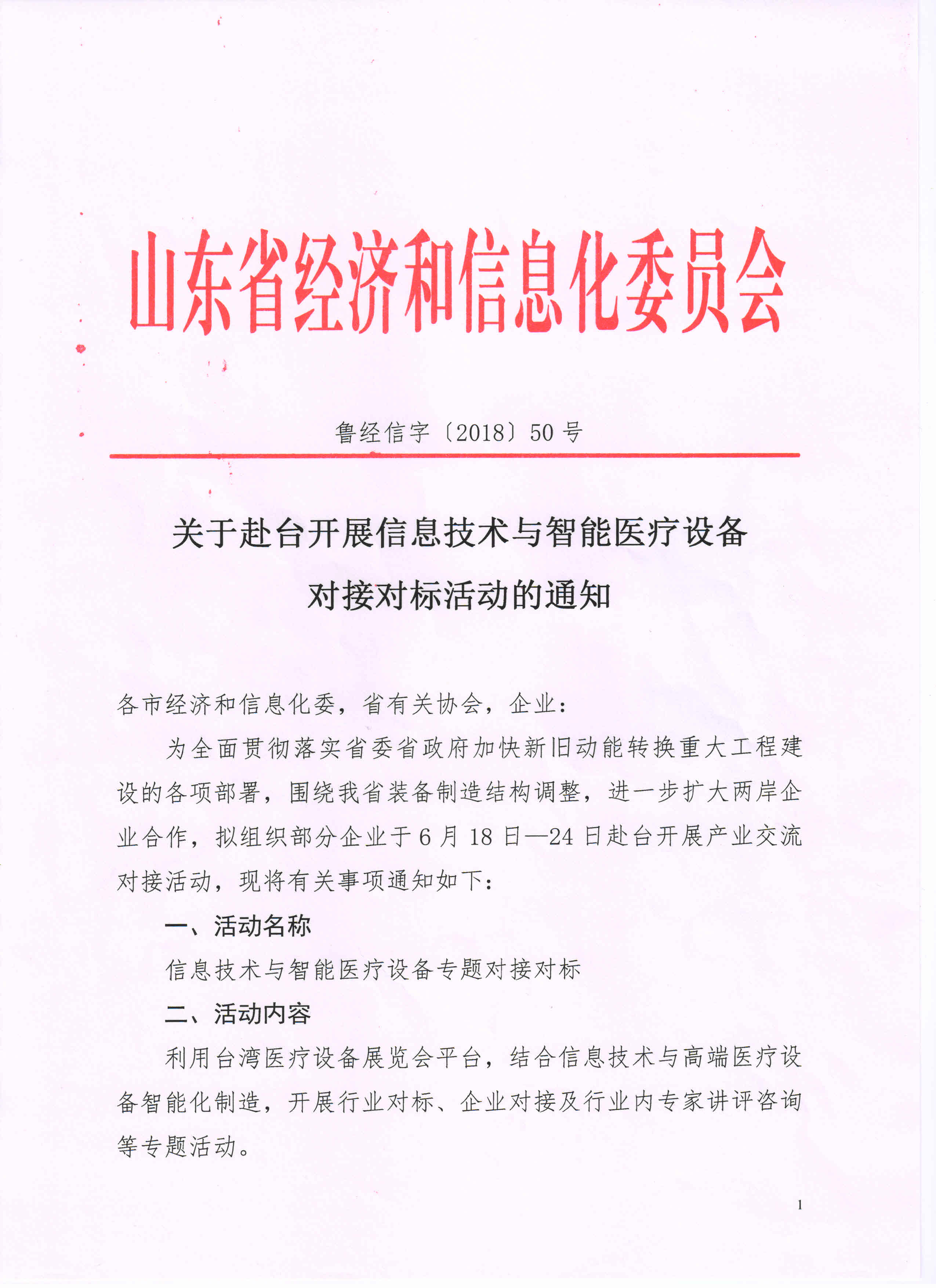 为进一步深化鲁台企业务实合作,贯彻落实省委省政府加快新旧动能转换重大工程建设的各项部署,山东省经信委拟组织部分企业于6月18日-24日赴台开展产业交流对接活动。