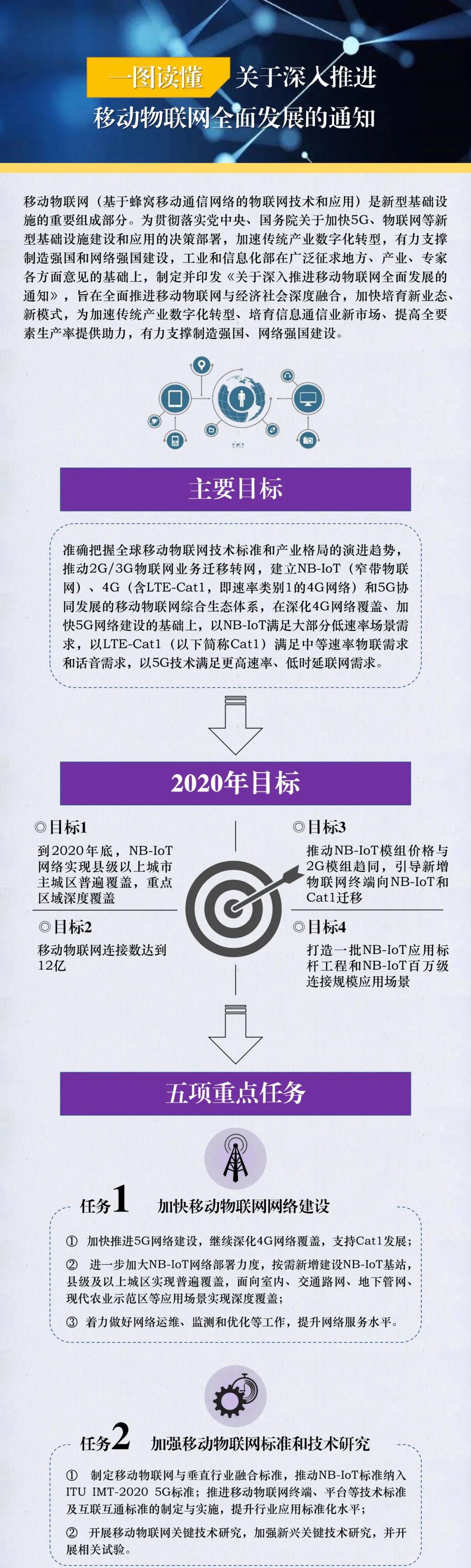 工业和信息化部近日印发《关于深入推进移动物联网全面发展的通知》,提出了什么发展目标?将完成哪些重点任务、采取哪些保障措施?一图读懂↓↓