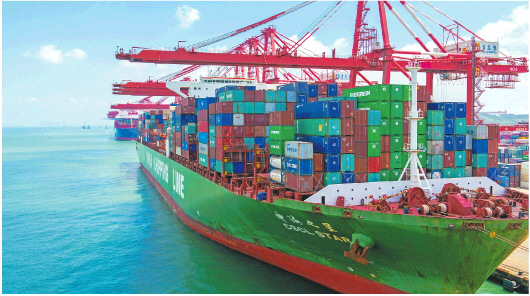 图为青岛港集装箱码头,一艘货轮正在装卸货物。