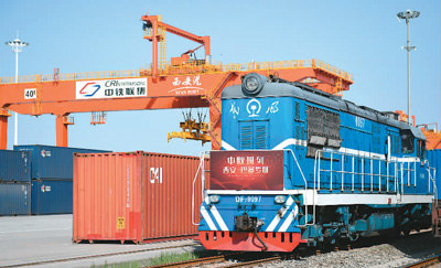 4月8日,满载50个集装箱太阳能板的75019次中欧班列从中国铁路西安局集团有限公司新筑车站驶出。这趟首开列车由陕西省西安市发往西班牙巴塞罗那,全程约1.2万公里。图为列车在新筑车站等待发车。