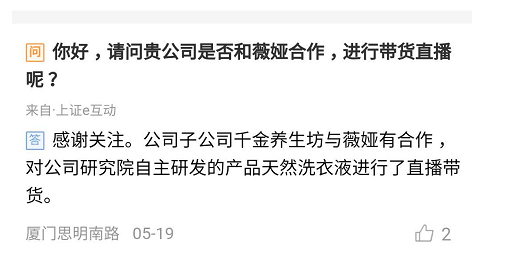 更让人咋舌的是,主播不仅能“带货”,还能“带股”,越来越多的上市企业开始蹭起了直播带货的热点。5月19日,千金药业接连发布多条互动信息确认:公司子公司千金养生坊与薇娅有合作,对公司研究院自主研发的产品天然洗衣液进行了直播带货。当天下午,千金药业股价直线拉升,大幅上涨3.38%,截至收盘,千金药业报收9.29元/股,上涨4.74%。
