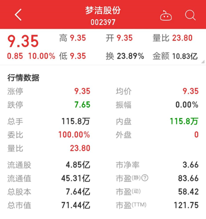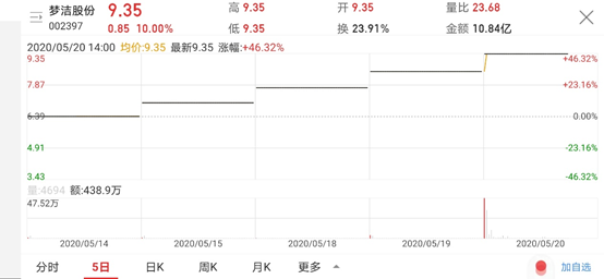 消息一出,梦洁股份的股价迎来暴涨,并在9个交易日里轻松斩获8个涨停板。5月20日,梦洁股份再次一字涨停,公司市值已经暴增34亿元,近乎翻倍,这一连串的疯狂表现令人咋舌。