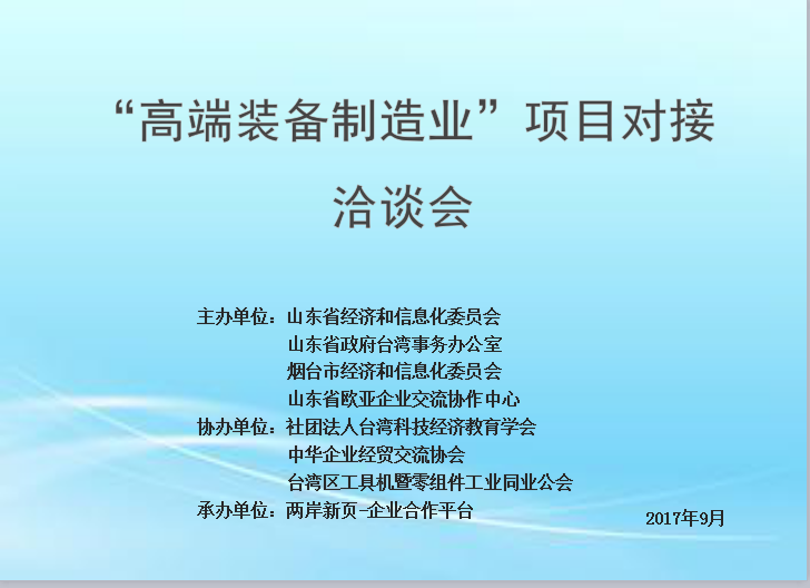 9月3日台湾高端装备制造业代表团一行10人受邀赴烟台参加“高端装备制造业”项目对接洽谈会,洽谈会由省经信委、省台办、烟台市经信委、烟台市台办、山东省欧亚企业交流协作中心主办,社团法人台湾科技经济教育学会、中华企业经贸交流协会、台湾区工具机暨零组件工业同业公会协办。