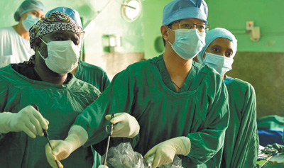 在纳兹莫加医院工作的第二天,医疗队队长蒋国庆就带着当地医生拉希德进行了一台腹腔镜胆囊切除术。“蒋队长,为什么你只开3个孔来手术?我见到的医生都是开4个孔,那样手术好像更容易。”刚毕业的拉希德好奇地问。蒋国庆解释道:“三孔法是世界外科学界推荐的手术方法,少开1个孔不但能减少患者的创伤,也可以减少1名手术助手,节省人力。”
