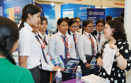 6月18日,在尼泊尔首都加德满都举行的2024中国高等教育展上,尼泊尔学生与中国高校代表互动。(新华社发)