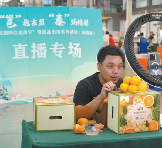 “东盟网红走南宁”暨邕品出海系列活动中,主播在推介南宁沃柑。南宁市商务局供图