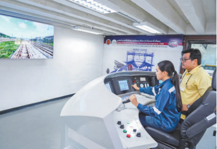 在泰国春武里技术学院内,教师正指导轨道交通专业学生操作高铁模拟驾驶设备。