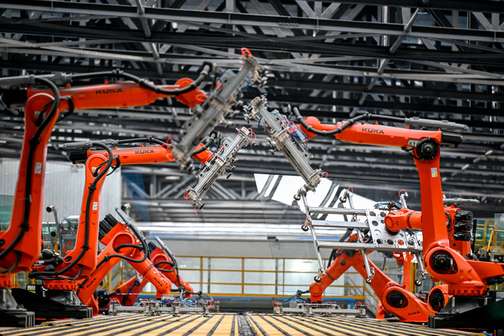 3月15日,在准格尔旗一家玻璃制造企业,智能机械臂在流水线上作业。(新华社)
