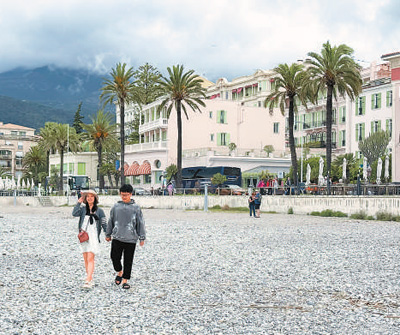图为近日,两名中国游客在法国芒通福桑海滩上散步。