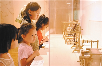 图为当地小朋友在“丝绸与丝路:从中国到哈萨克斯坦”展览上参观织机和缫丝机模型。
