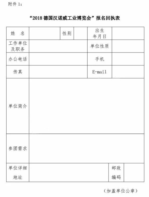 附件1:“2018年德国汉诺威工业博览会”报名回执表