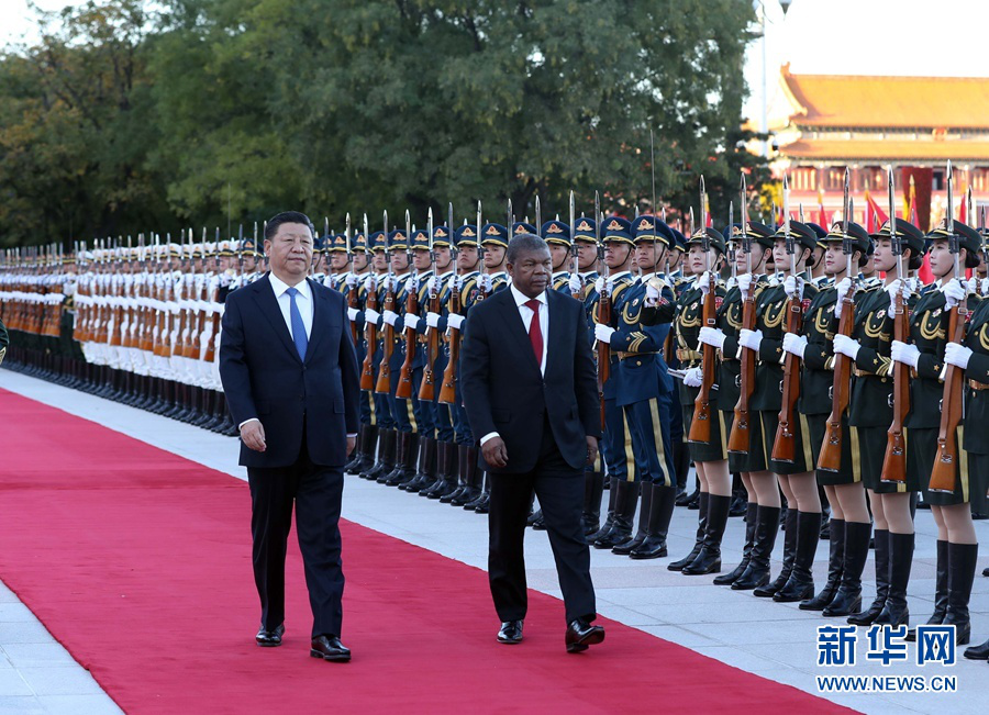 10月9日,国家主席习近平在北京人民大会堂同安哥拉总统洛伦索举行会谈。这是会谈前,习近平在人民大会堂东门外广场为洛伦索举行欢迎仪式。(图片来源:新华社 刘卫兵摄)