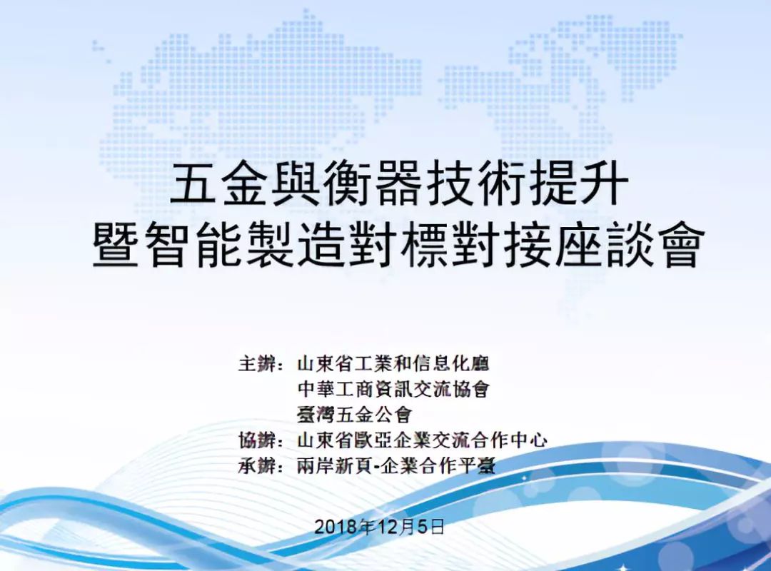 12月5日下午,由山东省工信厅、山东省五金与衡器行业协会、台湾五金公会、中华工商咨询交流协会主办,山东省欧亚企业交流协作中心(以下简称“欧亚中心”)协办,两岸新页企业合作平台承办的“五金与衡器技术提升暨智能制造对标对接座谈会“在台湾成功举办,鲁台双方共计60余人参加会议。