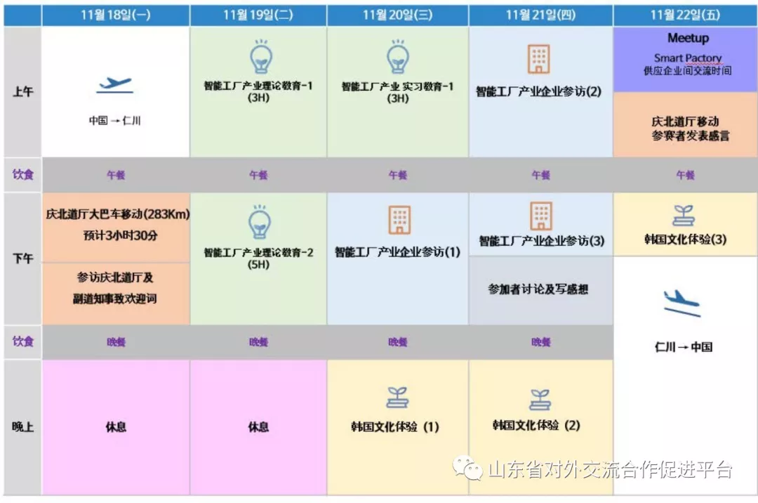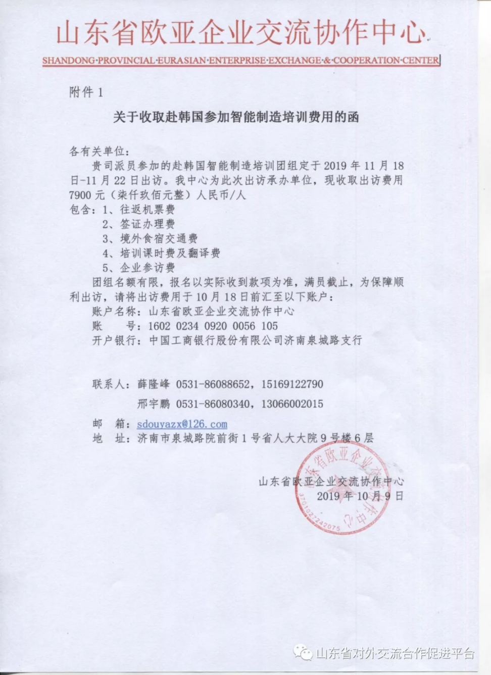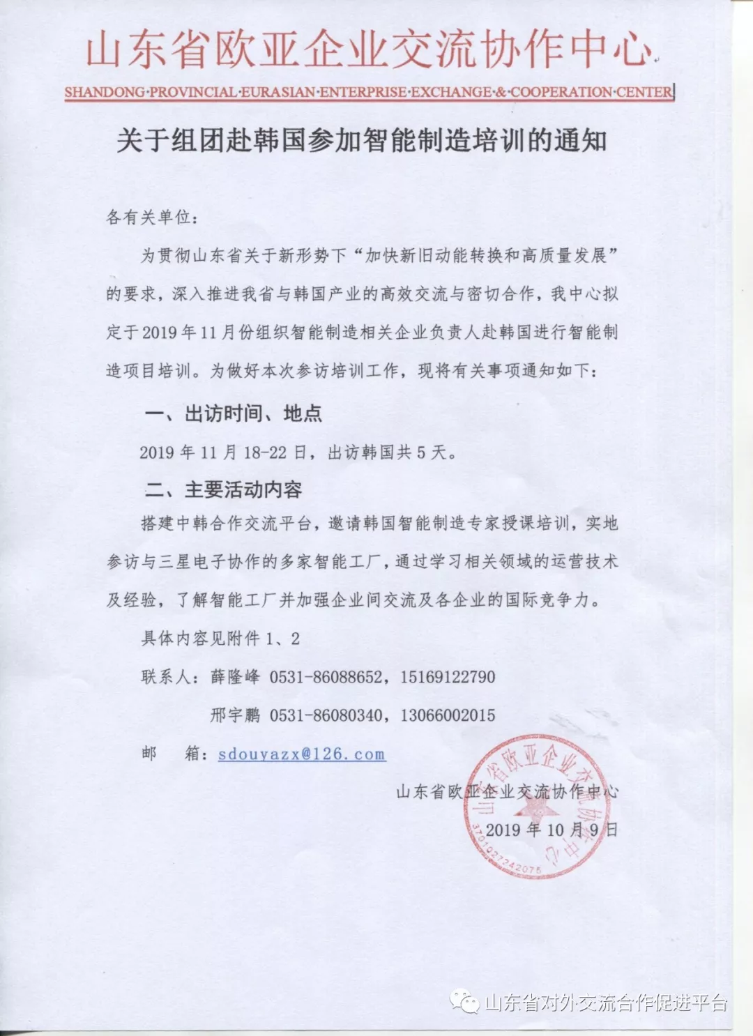 为贯彻山东省关于新形势下“加快新旧动能转换和高质量发展”的要求。深入推进我省与韩国产业的高效交流与密切合作。山东省欧亚企业交流协作中心拟定于2019年11月份组织智能制造相关企业负责人赴韩国进行智能制造培训项目。机不可失,时不再来,有意向企业请抓紧报名。