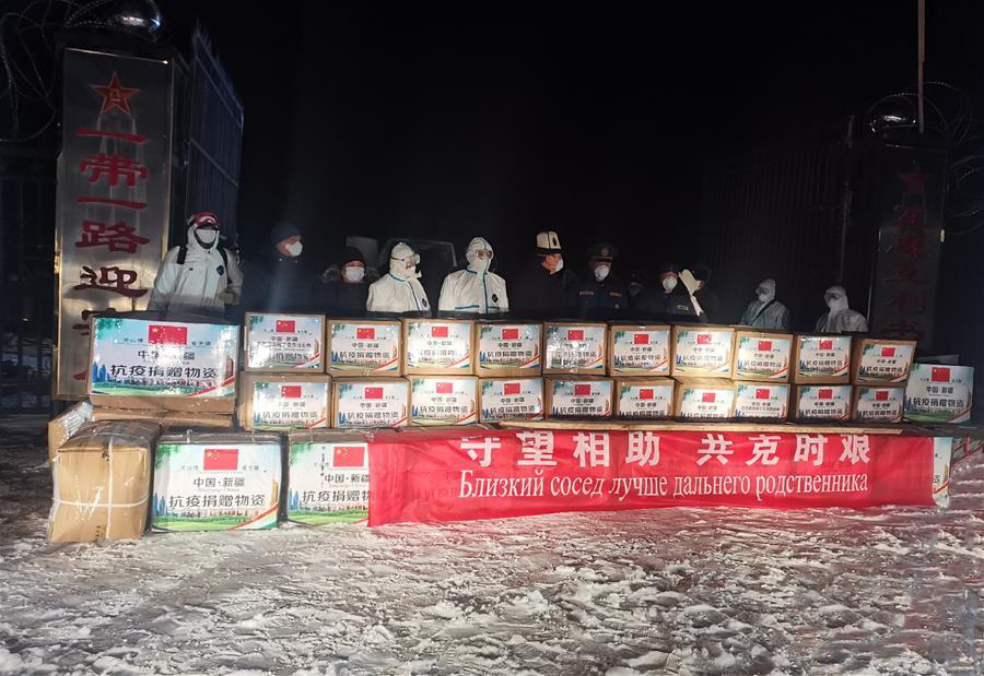 面对肆虐的疫情,一批批中方物资跨越天山,穿越伏尔加河,飞越高加索山脉,抵达亚欧抗疫一线。中国向格鲁吉亚捐赠的1000套新冠病毒检测试剂盒已投入使用;山东省向哈萨克斯坦捐赠10万只口罩和6000件防护服;乌鲁木齐市向哈捐赠的18万只口罩已经霍尔果斯口岸运往防疫一线;在中吉边境吐尔尕特口岸,由新疆维吾尔自治区援助的抗疫物资交付吉尔吉斯斯坦;由马云公益基金会和阿里巴巴公益基金会捐赠的100万只口罩和20万份检测试剂由俄国防部专机送抵俄罗斯……从政府到企业,纷纷伸出援助之手。